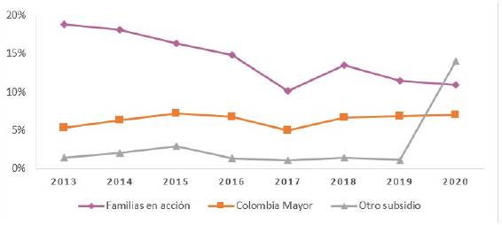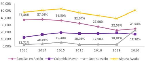 Teniendo en cuenta los datos de la Encuesta de Calidad de Vida (ECV), en la Fi gura 2 se observa una progresiva disminución en la cantidad de hogares que tienen acceso a Familias en Acción entre el 2013 y el 2020, en el caso de Colombia Mayor se observa una tendencia más estable entre el 5 % y el 7 %. Asimismo, se destaca que en el 2020 otros subsidios aumentaron considerablemente el número de be neficiarios debido a la creación del programa de Ingreso Solidario, que cubrió una gran parte de la población en edad productiva convirtiéndose en el programa con más beneficiarios.