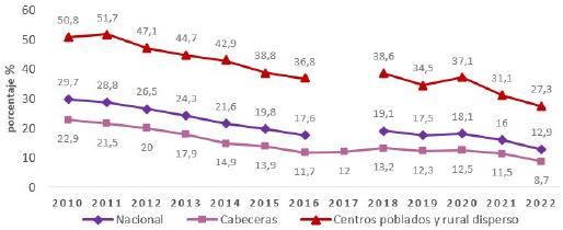 Sin embargo, en cuanto a la pobreza multidimensional se debe resaltar que as pectos como el acceso a educación, a servicios sanitarios y al empleo formal se afectaron fuertemente, lo que implicó un deterioro en los indicadores de salud, educación y trabajo del IPM. Precisamente, una vez se salió de la pandemia se observa un avance en el índice, situación que, de acuerdo con el DANE, está re lacionada con el indicador de asistencia escolar, el cual se recuperó una vez se volvió a la presencialidad. Si se observa el IPM de 2022, se puede apreciar una disminución importante frente al 2020, la cual, según el DANE, implicó la salida de 971.000 personas de la condición de pobreza multidimensional (DANE, 2023).