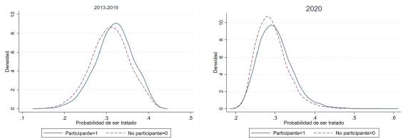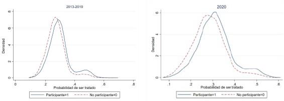Dada la estimación de las probabilidades de participación, se procede a evaluar un PSM incluyendo las variables utilizadas anteriormente y la probabilidad de par ticipación calculada, con el fin de determinar un soporte común entre los indivi duos tratados y los no tratados. En las figuras 4 y 5 se presentan de manera gráfica los soportes calculados en los que se observa un soporte común suficiente para realizar las regresiones.