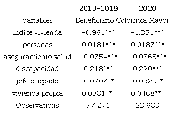 Los resultados de la Tabla 2 muestran que las variables son significativas para estimar la probabilidad de participación en el programa Colombia Mayor. Se ob serva que, a medida que mejoren las condiciones asociadas al índice de vivienda, las probabilidades de participar en este programa se reducen. Además, cuando el jefe de hogar está ocupado, la probabilidad de ingresar al programa también disminuye. Por otro lado, los hogares más grandes, es decir, aquellos con mayor cantidad de personas, tienen más probabilidades de tener al menos un miembro seleccionado para participar. De manera similar, tener una discapacidad y vivir en una vivienda que no es propia también aumenta las probabilidades de ser elegido para participar en Colombia Mayor.