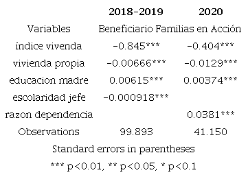 En el caso de Familias en Acción, en la Tabla 3 se observa que contar con mejo res condiciones según el índice de vivienda reduce las probabilidades de participar en el programa. Del mismo modo, tener una vivienda propia y un nivel educativo más alto por parte del jefe de hogar también disminuye las probabilidades de per tenecer al programa. Por otro lado, la educación de la madre y una alta razón de dependencia aumentan las probabilidades de ser seleccionado para participar en el programa.