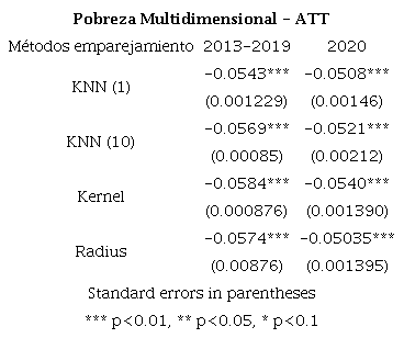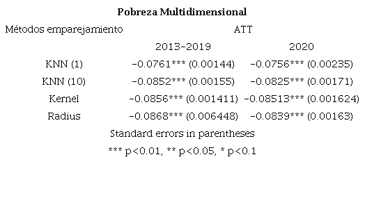 Finalmente, se estima el impacto sobre la variable resultado de pobreza multidi mensional para los programas Colombia Mayor y Familias en Acción. En las tablas 4 y 5 se presenta el efecto estimado mediante tres métodos de emparejamiento usualmente utilizados en el PSM: el K-nearest-neighborhood (KNN) con uno y con diez vecinos, el Kernel y, por último, el método de radius.