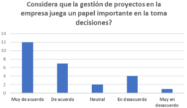 Tras el riguroso proceso de investigación llevado a cabo, el presente trabajo arroja luz sobre un aspecto fundamental en la creación de conocimiento. En el Gráfico 1 se refleja de manera elocuente la importancia de la gestión de proyectos en la toma de decisiones. Se advierte la recomendación de implementar la meto dología PMI en la gestión de proyectos con un marcado impacto tecnológico. Esta metodología se destaca por su capacidad para aumentar la eficiencia y eficacia, permitiendo la identificación de etapas críticas para lograr un cierre exitoso, tal como ha sido expuesto en la teoría de las ventajas competitivas (Trujillo & Guzmán, 2007; Nagy et al., 2018).
