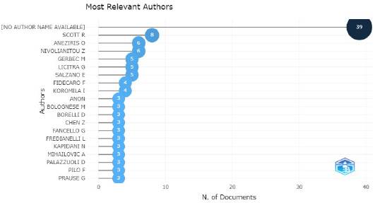 Basado en los datos presentados en el Gráfico 9, se identifican los autores más destacados en el tema de investigación, aquellos que han contribuido con dos o más publicaciones cada uno: Scott R., Aneziris O., Nivolianitou Z., Gerbec M. y Licitra G.