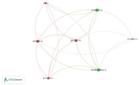 En el Gráfico 10, se observa la relación y colaboración entre los autores, repre sentada a través de un mapa de relaciones y colaboración generado con el soft ware VOSviewer. Se han considerado autores con al menos tres (2) publicaciones, seleccionando así a 73 autores para el análisis, que ha revelado la existencia de 2 grupos claramente definidos. El primer grupo está compuesto por (4) autores: Salzano, Pilo, Gerbec y Koromila, mientras que el segundo grupo está integrado por (3) autores: Aneziris, Koromila y Nivolianitou.