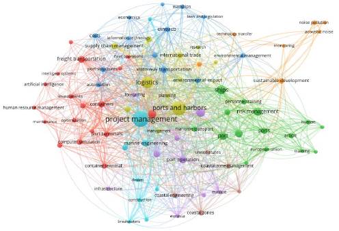 En el primer clúster, las palabras más relevantes incluyen: project management, marine engineering, diseño, entre otros. El segundo clúster muestra palabras como: risk management, puerto, buque, etc. En el tercer clúster, destacan palabras como: transferencia de tecnología, desarrollo sostenible, monitoreo, etc. Mientras que el cuarto clúster presenta términos como: transporte de carga, contenedo res, gestión de recursos humanos, etc. En el quinto clúster, se destacan palabras como: logística, gestión de la cadena de suministro, comercio internacional, etc. El sexto clúster incluye términos como: infraestructura, operación portuaria, pronós tico, etc. Finalmente, el séptimo clúster revela palabras como: transporte fluvial, estructuras portuarias, economía, etc.