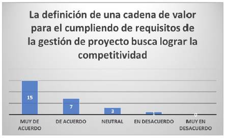 Lo anterior, define la implementación de cuadros de riesgos en la fase de planeación estratégica (Albareda, 2022), capaz de garantizar el área de gestión de proyectos como impacto esperado en la cadena de valor de caídas inesperadas e inciertas del servicio logístico de puertos y destinar recursos en los planes de contingencia en la prevención de problemáticas, como se puede ver en el gráfico 5 los encuestados están muy de acuerdo con la afirmación, esta debe ser la ruta de competitividad en cumplimiento de los requisitos de la gestión de proyectos como mecanismo de los operadores logísticos (Sacca, 2022).