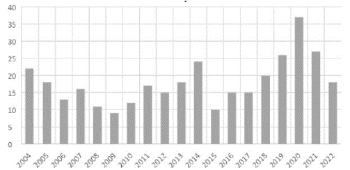 El Gráfico 4 ofrece una representación visual de la tendencia de las publicacio nes relacionadas con el tema de investigación a lo largo de las últimas dos déca das. Revela un crecimiento continuo a pesar de varias oscilaciones, las cuales no han impactado negativamente en la expansión general de la producción de dichas publicaciones. Además, esta dinámica se complementa y se profundiza con la in formación presentada en el Gráfico 5.