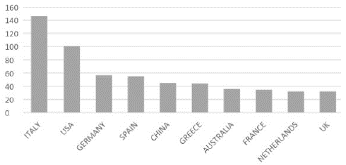 Al analizar las contribuciones realizadas por distintos países, los Gráficos 6a y 6b resaltan a Italia (146), Estados Unidos (101), Alemania (57), España (55) y Chi na (54) como las naciones que más aportan al área de investigación.