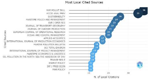 El Gráfico 7 ofrece una visualización de las principales revistas que contribuyen significativamente a la investigación dentro del tema de interés de este informe. Las cinco revistas locales más citadas son: Mar Pollut Bull, Accid Anal Prev, Sus tainability, Maritime Policy and Management, y Eur J Oper Res, las cuales en con junto representan la mayor parte de los documentos recuperados en esta área de estudio.