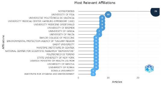 El Gráfico 8 muestra los cinco institutos con una notable presencia en las pu blicaciones sobre el tema de investigación. Estos institutos son Notreported, Uni versity of Pisa, University Politecnica de Valencia, University Medical Center Hamburg-Eppendorf y University Medicine of Bremen, destacándose por su contribu ción significativa en este campo de estudio.