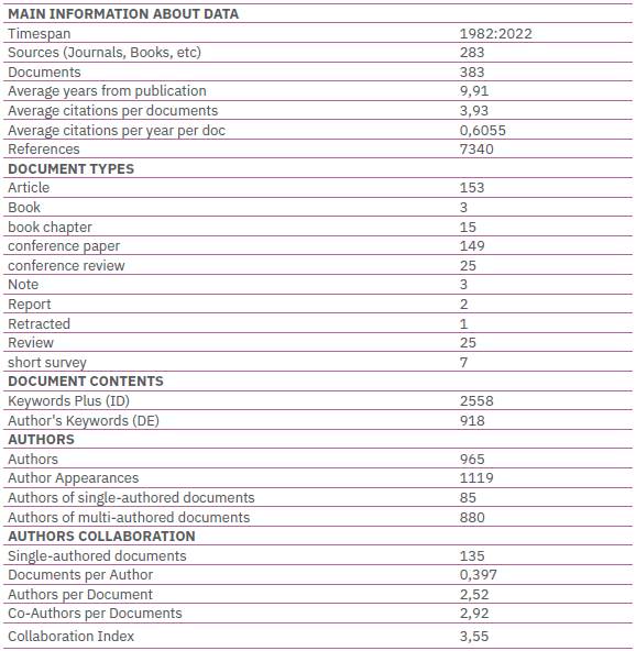 De igual manera, en el marco de esta metodología, se realizó un análisis bibliométrico exhaustivo (o revisión bibliométrica) relacionado con el tema de investiga ción. La revisión bibliográfica se llevó a cabo a través de la plataforma Scopus, em pleando términos clave como "port logistic", "maritime logistics", "maritime ports" y "Project management". La ecuación de búsqueda se conformó de la siguiente manera "(TITLE-ABS-KEY (port AND logistics) OR TITLE-ABS-KEY (maritime AND logistics) OR TITLE-ABS-KEY (maritime AND ports) AND TITLE-ABS-KEY (project AND management))". Tras la ejecución de la búsqueda, se logró recopilar un total de 383 documentos relevantes. Para ampliar la búsqueda con sinónimos de las palabras clave, se utilizó el operador booleano OR en la ecuación. Estos documen tos fueron sometidos a un análisis exhaustivo mediante el uso del paquete Bibliometrix dentro del software estadístico R, arrojando como resultado los siguientes hallazgos y conclusiones relevantes.