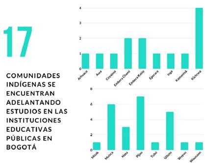 Así mismo, dentro de la información aportada por la Dirección de Inclusión e Integración de Poblaciones se identifica que un total de 17 grupos étnicos tienen a sus niños, niñas y adolescentes adelantando estudios en las localidades de Bosa, Ciudad Bolívar, Engativá, Fontibón, La Candelaria, Los Mártires, Puente Aranda, San Cristóbal, Santa Fe, Suba y Usme, en 22 instituciones educativas. En la siguiente gráfica se puede visualizar las comunidades indígenas que han accedido a las ins tituciones en Bogotá en las localidades mencionadas anteriormente conforme a la información de la Secretaría de Educación Distrital: