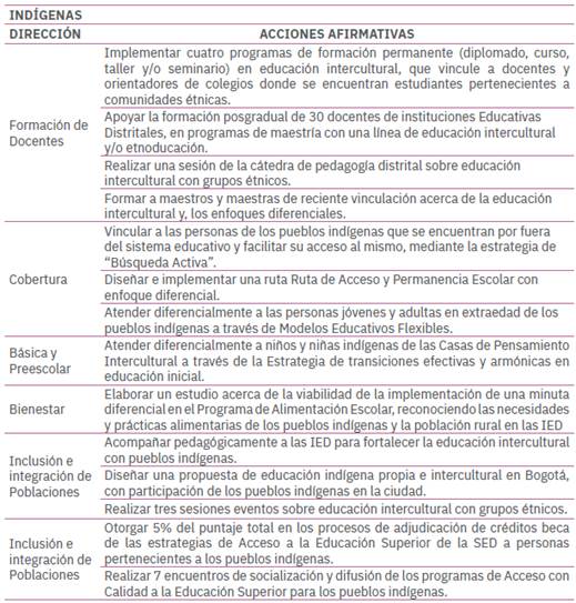Así mismo, la SED por medio de programas de concertación ha logrado convenir con los pueblos indígenas, acciones afirmativas que se desarrollaron en el marco del Acuerdo 645 de 2016 - Bogotá Mejor para todos - para garantizar los derechos de los pueblos indígenas que residen en la Ciudad, a saber: