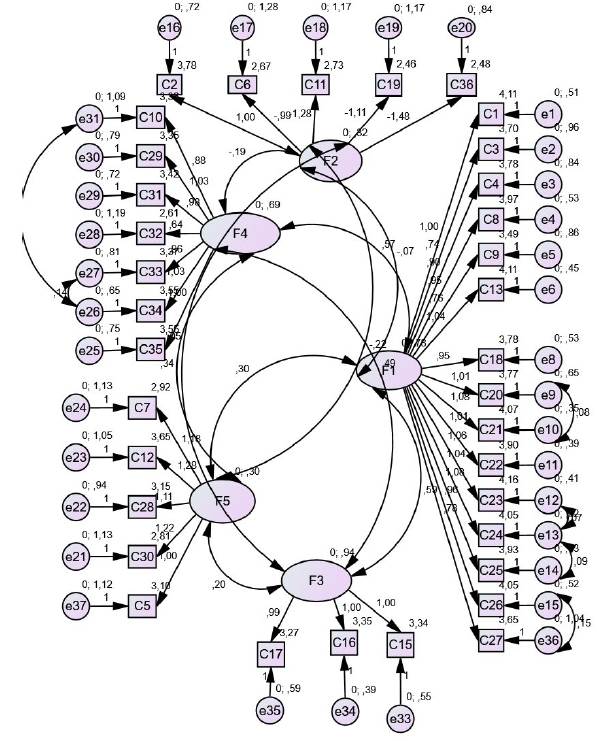 A través de un balance entre coherencia teórica y criterios empíricos de ajuste del modelo a los datos, se efectuaron ajustes y modificaciones modeladas, como la eliminación del ítem C14 y la reespecificación del ítem C5 al Factor 5 (F5).