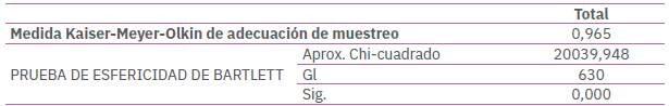 Por otro lado, la Prueba de Esfericidad de Bartlett, introducida por Bartlett (1950), se utiliza para examinar la hipótesis nula de que las variables en el análisis están intercorrelacionadas en la población. En este análisis, la significatividad de la Prueba de Esfericidad de Bartlett (x2 = 20039.948, p < 0.000) justifica proceder con el análisis factorial, indicando la adecuación de los datos para el análisis.