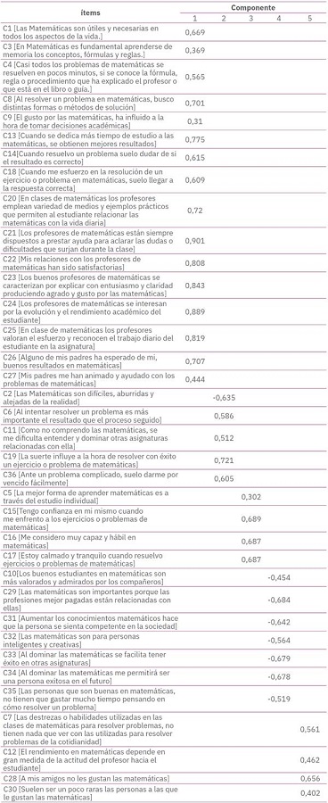 La asignación de ítems a cada factor se basa en sus cargas factoriales y debe ser interpretada en el contexto de la teoría subyacente y el marco conceptual de la investigación (Byrne, 2016), asegurando que cada ítem represente de manera precisa aspectos vinculados a las creencias sobre las matemáticas.