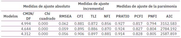 Las medidas de ajuste implementadas se dividen en categorías absolutas, incrementales y de parsimonia. En el ámbito del ajuste absoluto se contempla el CMIN/DF, Chi cuadrado y RMSEA (Steiger, 1990); mientras que, en cuanto al ajuste incremental, se tienen en cuenta el CFI, TLI y NFI. Por otro lado, para apreciar la parsimonia del modelo, se utilizan PRATIO, PCFI, PNFI y AIC (Akaike, 1974).
