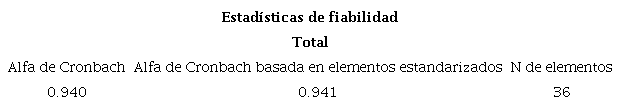En este caso, se tiene una alfa de Cronbach de 0.940 y una alfa de Cronbach basada en elementos estandarizados de 0.941 para un test de 36 ítems. Este valor superior a .9 sugiere que el instrumento tiene una excelente contabilidad o consistencia interna Cronbach (1951). Esto indica que los ítems del instrumento están altamente interrelacionados y miden el mismo constructo subyacente.