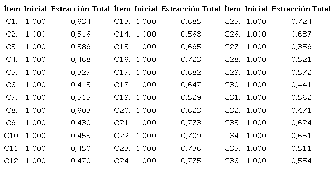 En la Tabla 3 se observan las comunalidades antes y después de un proceso de extracción en el análisis factorial. Inicialmente, todas las comunalidades presentan un valor de 1.000, indicando que, previo al proceso, se asumió que la totalidad de la varianza de cada ítem podría ser explicada por el análisis. Sin embargo, después de dicho proceso, las comunalidades, como es usual, experimentan una disminución.