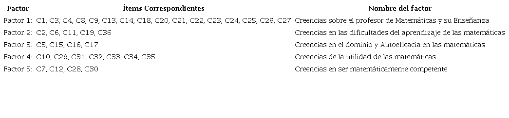 Esta sección de tu trabajo sería donde discutes la relación entre los factores identificados y los ítems, interpretando los resultados en el contexto de tu investigación y en relación con las creencias sobre las matemáticas.