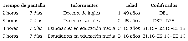 En la Tabla 1, se especifica la codificación utilizada (DE1 - Significa docente in glés 1), (DS1, DS2 es docente sociales 1 y 2) (E1.15, E2.15, E3.15- es estudiante 1, 15 en relación a la edad y así sucesivamente los otros informantes claves.