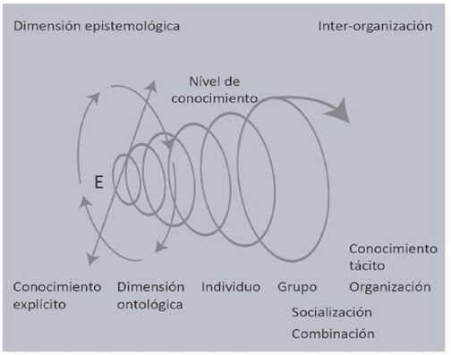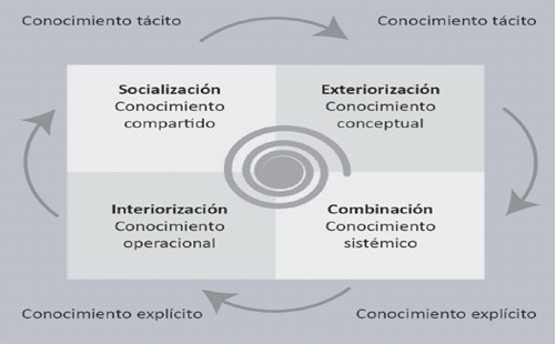 Según Davenport y Prusak (2001), la GC hace hincapié en que debería preocuparse por explotar y desarrollar los activos del conocimiento que posee la organización con el propósito de que esta sea capaz de cumplir con su misión estratégica. La utilidad del conocimiento está en su proceso de conversión: interiorización, socialización, combinación y exteriorización, por lo que también se hace necesario entender las formas de interacción del conocimiento tácito y explícito dentro de un marco organizacional, el cual se puede observar en el modelo de Nonaka (2007), The Spiral of Knowledge, que se presenta a manera de esquema en la Figura 1, de Nonaka, 2007.
