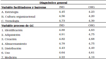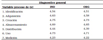 A continuación se muestra el diagnóstico general según los empleados de alto cargo de la organización, la Tabla1, muestra cada una de las variables analizadas de los procesos de la GC. La segunda columna muestra el promedio de la valoración general de cómo perciben los empresarios que se lleva a cabo cada proceso de la GC de manera IND y la tercer columna muestra el promedio de la valoración de cómo perciben que se lleva a cabo dicho proceso de manera ORG. La principal debilidad en el proceso de medición, ya que fue el que obtuvo menor promedio.