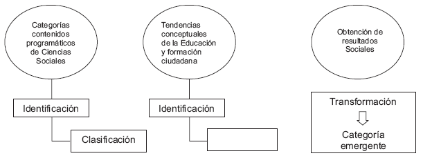La presentación y el análisis de los resultados se construyó a partir de la presentación en tablas donde se muestran las categorías apriorísticas y las categorías emergentes de los diferentes programas, el análisis se produjo a partir de las redes de contenidos de los programas y las categorías apriorísticas que nacen de la teoría. A continuación se presentaron las matrices de los contenidos programáticos de las asignaturas: Geografía general y de Venezuela, historia de Venezuela y educación familiar y ciudadana todas estas del área del conocimiento de las ciencias sociales.