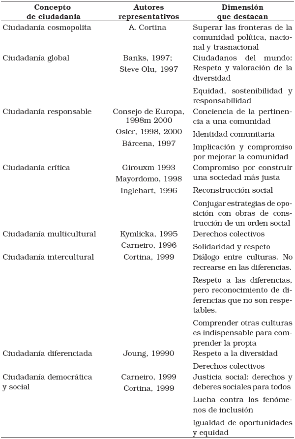 En primer término se tiene a Gómez (s/f) en el cual cita a Cabrera (2000), con una matriz donde se manifiestan las nuevas conceptualizaciones en torno a la ciudadanía.