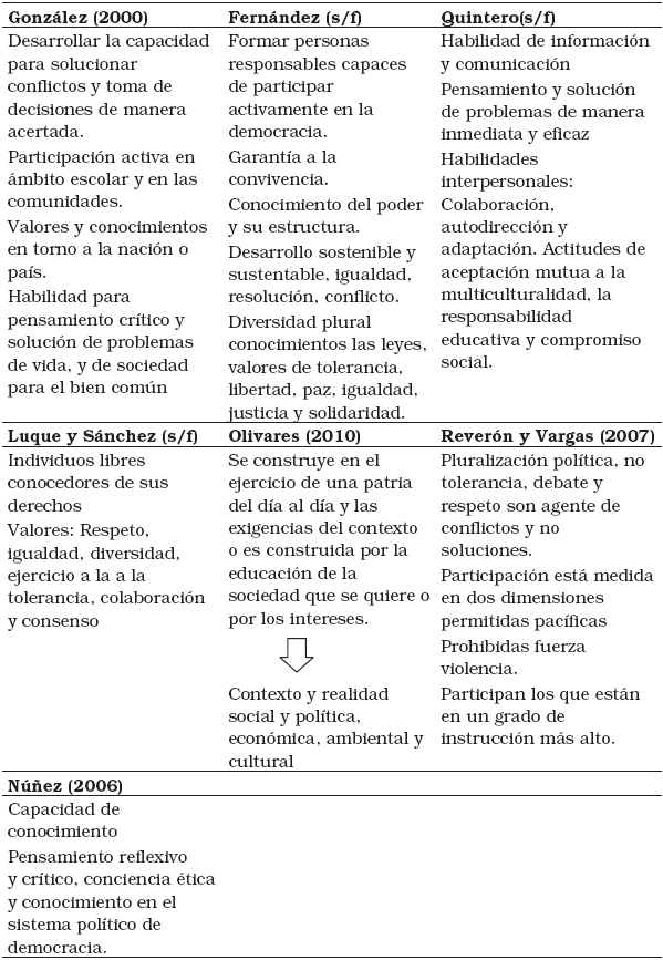 Otro aporte lo realiza Núñez (2006), al señalar que la educación a los ciudadanos para darle vida democrática conserva un área prioritaria de investigación y análisis, de tal manera que el individuo se forme y geste su rol como ciudadano integrante de una comunidad, en donde desarrolle capacidades de búsqueda de conocimiento, pensamiento reflexivo, actitud crítica, conciencia y ética bajo un sistema político de democracia. Las tendencias de la Educación y la formación ciudadana se puede vislumbrar en la Tabla 2.
