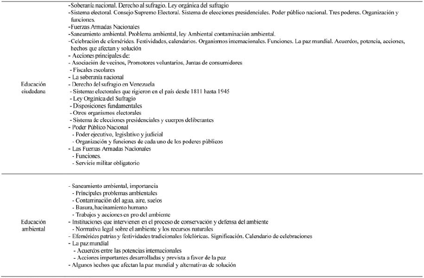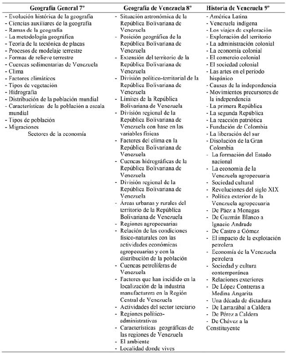 Fuente: Currículos MR (1985)En la Tabla 1 y 2 se observaron contenidos programáticos de la geografía general, geografía de Venezuela, historia de Venezuela y la educación familiar y ciudadana. En el programa de Geografía General se observan temas de corte geográfico pero desde la concepción tradicional del enfoque determinista donde el espacio físico natural es el eje primordial de la enseñanza de la geografía dejando a un lado la tendencia conceptual idónea para los actuales momentos.