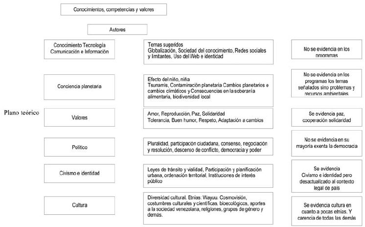 En cuantos a las competencias, temas, información y valores para la formación ciudadana se identificó desde de la revisión documental de las tendencias del área planteada anteriormente (ver Tabla 1), siete categorías son las que emergieron y que necesariamente, todo currículo debe implementar temas, prácticas, y estrategias que desarrollen el conocimiento de las mismas. Dentro de las cuales tenemos en primer lugar las TIC (Tecnologías de la información y la comunicación) en esta categoría fe de total carencia en los programas instruccionales, lo cual implica elaboración de una propuesta para la incorporación de las misma en todo los niveles del sistema educativo. La tendencia mundial es el manejo y desarrollo de las tecnologías de la comunicación e información. Por tanto todo ciudadano debe conocer manejar y desarrollar las mismas o estar en el ímpetu de crear o superar las mismas.