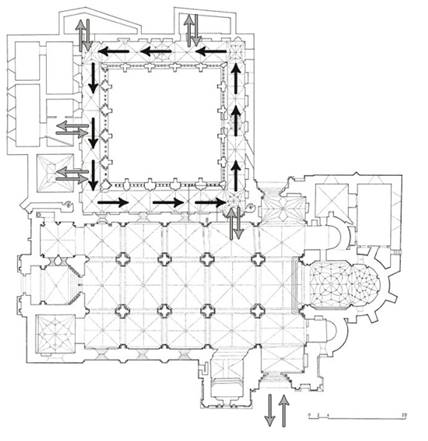 Tal y como podemos observar en el plano que acompaña a estas líneas (Figura 2), se pueden definir una serie de vectores que delimitan una evidente direccionalidad de los trazos que obliga, de manera inexorable, a realizar el recorrido procesional de los viacrucis pintados o tallados que se colocaron de forma diacrónica sobre los muros y una liminaridad representada por las cruces que se grabaron en los umbrales de las puertas, que permiten salir o entrar al espacio privativo del claustro o las que se abren en los lienzos exteriores para acceder al interior del templo. Unas y otras vienen a dar cuenta del ambiguo valor del trazo cruciforme en función de su hechura y, sobre todo, de su ubicación sobre el soporte parietal, aspecto que ha dado lugar a interesantes debates en torno a sus significados plurales y que permite lecturas que van más allá de una clasificación tipológica que, para el caso que nos ocupa, apenas si permite un encuadre cronológico bastante laxo, a causa de que no todas las cruces grabadas sobre la pared significan lo mismo a lo largo del tiempo (Cruz, 2014: 72). La catedral mirobrigense permite analizar un complejo palimpsesto de símbolos que da pie a dibujar una micro-topografía sagrada que obliga a repensar, en clave antropológica, el fenómeno de plasmar cruces en la arquitectura no como meros detentes o los espantabrujas de la arquitectura popular de las sierras salmantinas (Cea, 2005: 91), las cruces con carácter apotropaico de la ciudad de Cuzco (Carreño, 2019) o simples emblemas decorativos e identificadores, sino como “acciones rituales y gestuales” con un significado profundo en función de su posición topográfica específica, sus niveles de repetición y diacronía. Es así como podemos comprender e interpretar en clave ritual la yuxtaposición sucesiva de estaciones y calvarios de tres series de viacrucis -permanencia del rito- o la hechura artesanal y las huellas de sobado de las cruces grabadas que se localizan en las jambas de las puertas de acceso, repitiendo, además, una práctica que se documenta en la arquitectura doméstica a lo largo de todo el Antiguo Régimen, en el que lejos de emitir mensajes efímeros dejó plasmadas las prácticas de religiosidad cotidianas y extraordinarias más comunes del momento. En este sentido, Jean Marie Hoppe en su estudio sobre la teología de la cruz, describe tres categorías: 1) como objeto de espera escatológica; 2) como extensión cósmica de la redención y 3) como límite (Hoppe, 2004: 329-330), dentro de las cuales hallaríamos la razón profunda de su presencia en el soporte parietal.