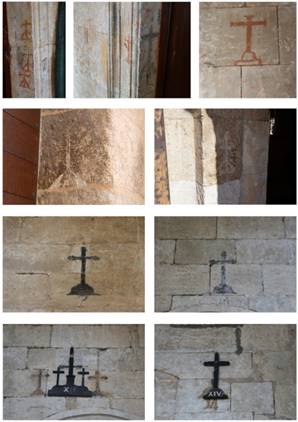 Mientras que en la panda occidental se documenta la presencia de nueve cruces, todas en silueta de calvario pintadas con almagre de color rojizo y, en menor número, en pintura negra, en la septentrional recogemos la presencia de tres cruces en silueta de calvario, una pintada y otra de madera correspondiente a las estaciones de viacrucis IX y X. Por su parte, las pandas oriental y meridional ofrecen un complejo palimpsesto de cruces en el que se entremezclan las cruces pintadas en negro o almagre con las cruces de madera que rinden, en este caso, continuidad al viacrucis de la panda norte; documentamos la presencia, en concreto, de once ítems en el lado este y otros tantos en el lado sur, entremezclándose las cruces de madera, más modernas que las pintadas -nuevamente en negro o rojo almagre- que ofrecen, en conjunto, cierta estratificación en cuanto a tamaños, pero no en lo relativo a su posición en la pared, ya que se han dispuesto a una cierta altura en el lienzo, formando una suerte de recorrido direccional muy específico a lo largo del claustro.