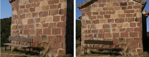 En conjunto, los muros exteriores de la iglesia conserva un total de 96 cruces grabadas sobre la roca de textura areniscosa de la ermita que se encuentran desigualmente repartidas entre el lienzo meridional (8 cruces), esquina suroriental (8 cruces) y cabecera (85 cruces)3, cuyas tipologías se reparten entre cruces sencillas, en silueta de calvario, cruces recuadradas, cruces sobre orbe o cruces rematadas en círculos, tipos muy comunes que documentamos en este territorio a lo largo de toda la Edad Media y Moderna, circunstancia que nos exime de elaborar la siempre tediosa tarea de comparación con ejemplos similares.