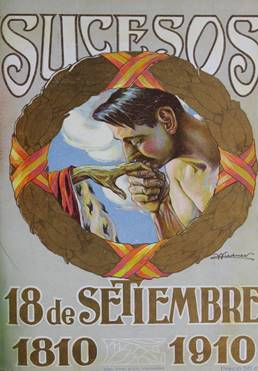 La exhibición y sintonía de las líneas editoriales con las ideas de homogeneidad racial y modernización del país, se hacen visibles tempranamente en los magazines estudiados, demostrando a través de sus portadas la existencia de estos preceptos en sus contenidos, todas ellas de muy buena factura artística, usada como elemento de atracción y de acceso al contenido y al mensaje editorial, utilizando la tradición alegórica como recurso visual, aspecto que, no obstante, irá variando con el paso de los años. En el número especial de Sucesos dedicado al centenario de la independencia nacional, publicado el 3 de septiembre de 1910 (Imagen 1), ubica en portada el dibujo de la traza del litógrafo alemán Carlos Wiedner, que exhibe la imagen de hombre de tez blanca que honra con un beso a una mano ajada, propia de una persona anciana, en un gesto mayestático de gratitud y respeto. El laureado marco en el cual se inscribe la imagen, nos permite reconocer los colores rojo y amarillo de la bandera española. La alegoría apunta claramente a la representación de un Chile que, habiendo cumplido cien años de vida independiente, reconoce y valora su ascendencia española.