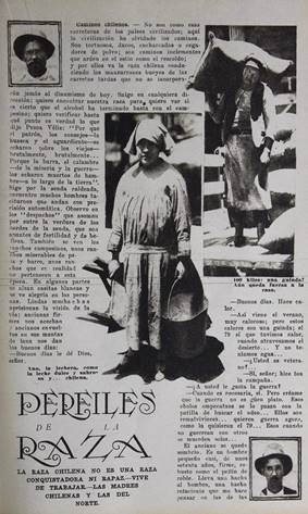En este mismo contexto se ubica el reportaje gráfico “Perfiles de la Raza”, publicado en Zig-Zag en diciembre de 1925 (Imagen 2). En este artículo el reportero Florencio Hernández, adentrado en el campo profundo del Chile central, se embarca en la búsqueda de una preconcebida “raza pura chilena”. Para ello, su reportaje da cuenta de un supuesto deterioro de “lo chileno” (tradicional y fundacional) reflejado en una decadente realidad de la vida campesina hacia 1925, señalando introductoriamente la existencia de vicios observados en el campo, como el alcoholismo y la pérdida de valores tradicionales.