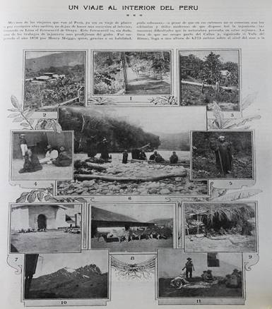 Uno de los primeros reportajes gráficos aparecidos en Zig-Zag, lleva por título “Un viaje al interior del Perú”, publicado en el N°86 de octubre 1906 (Imagen 4) y relata el viaje realizado por quien rubrica como Dr. Simon, por el ferrocarril Lima-La Oroya. En él se destacan los avances ingenieriles en cuanto la posibilidad de vencer las “inmensas dificultades que la naturaleza presenta”, destacándose también la labor de progreso llevada a cabo por colonos, sin dejar de observar con extrañeza la condición indígena: