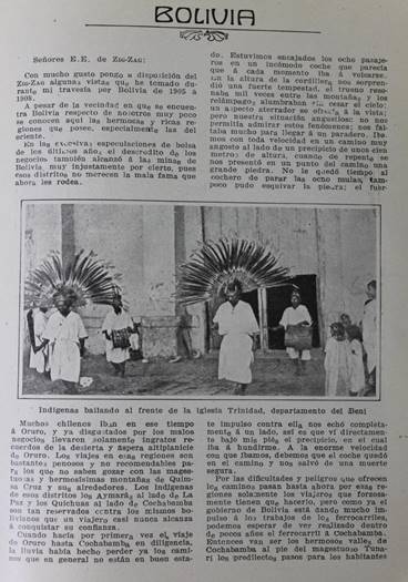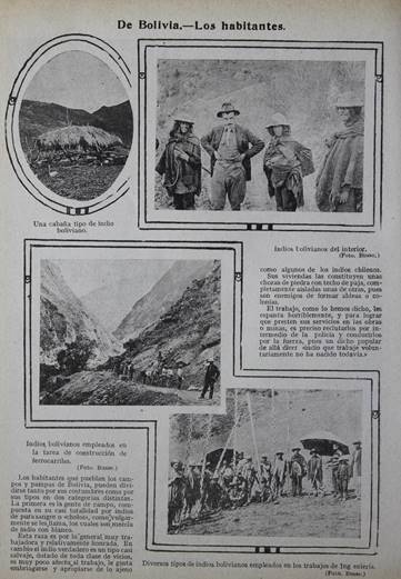 La editorial señala que en las fotografías “pueden verse algunas de indígenas, que el corresponsal llama “cholos”, nombre común que se da á los diversos tipos de razas aymará o quichúa. Hay en Bolivia 725.000 indígenas según últimas estadísticas. De ellos solo un diez por ciento se halla en plena barbarie” (Sucesos, 1911, N°164). El texto continúa refiriendo a ciertas características físicas y de carácter del indígena, aspecto que, como veremos más adelante, se replicarán en torno al indígena del norte chileno: