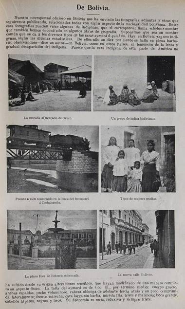 Siguiendo este tenor, en Julio de 1911, Sucesos publica “De Bolivia” (Imagen 7), nota que hace referencia al envío oficioso del corresponsal de la revista que busca presentar fotografías de “algún aspecto de la nacionalidad boliviana”. La nota expone en su componente gráfico, 6 imágenes que resumen la realidad boliviana: por un lado, el fuerte componente indígena reflejado en las imágenes “Un grupo de indias bolivianas” y “la entrada al mercado de Oruro”, así como la compleja realidad étnica en donde se identifica un componente criollo no indígena en “Tipos de mujeres criollas”; la composición visual colabora en la síntesis de la realidad boliviana, exponiendo imágenes de avances industriales “Puente recién construido en línea del ferrocarril a Cochabamba”, aspectos de desarrollo urbano “La plaza Diez de Febrero” y “La nueva calle Bolivar”.
