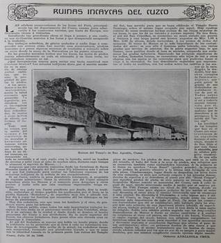 La cobertura respecto del pasado peruano y boliviano tiene temprana presencia en los magazines. Así, Zig-Zag N°184 del 13 de septiembre 1908 publica “Ruinas Incaycas del Cusco”, en un relato que se acompaña con una imagen de las “Ruinas del Templo de San Agustín, Cuzco” (Imagen 8). La publicación firmada por Octavio Adriasola, señala la fascinación que despierta el pasado ante turistas y estudiosos preferentemente europeos, que con frecuencia llegan al Cuzco, destaca la posibilidad de su estudio y la natural atracción del lugar y el legado cultural, sin dejar de observar con nostalgia el pasado y gloria de una historia ya perdida. Al respecto, en su descripción, destaca al sitio de Ollantaytambo, lugar donde indica la existencia de una: