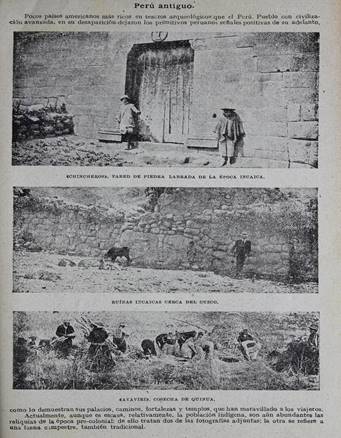 Sucesos N°584 del 13 de Noviembre de 1913 publica “Perú Antiguo”, que en gran forma resume la cobertura y enfoque de los reportajes gráficos respecto del pasado de Perú (Imagen 9), destacando la riqueza arqueológica, aludiendo a un: “Pueblo con civilización avanzada, en su desaparición dejaron los primitivos peruano señales positivas de su adelanto, como lo demuestran sus palacios, caminos fortalezas y templos que han maravillado a los viajeros”, destacando la monumentalidad de sitios arqueológicos que, por lo demás, llamaban la atención a nivel mundial en la época como objeto de aprecio, seguramente, orientado al lector letrado y consumidor de noticias referentes a descubrimientos, que para la época marcaban el quehacer científico. También se expresa la idea de la persistencia de un pasado que pervive de alguna manera en las poblaciones contemporáneas de entonces “actualmente, aunque sea escasa relativamente la población indígena, son aún abundantes las reliquias de la época pre-colonial: de ello tratan dos de las fotografías adjuntas; la otra se refiere a una faena campestre, también tradicional”.