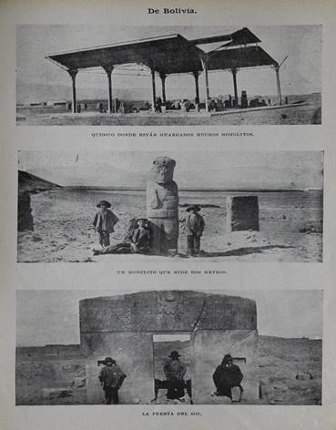La primera referencia a Tiwanaco, se observa en Sucesos del 9 de agosto de 1908, en el reportaje gráfico “Bolivia” (Imagen 10), publicado a días de conmemorado el día patrio del país altiplánico. En dicha publicación, conjuntamente con abordar aspectos virtuosos de Bolivia y su capital, refiriendo al desarrollo observado en las urbes, destacando “el grado de progreso y de cultura a que han arribado sus principales ciudades, así como las sorprendentes riquezas naturales con que la naturaleza ha dotado”, pone en relieve la coexistencia entre el desarrollo urbano y moderno de sus principales ciudades con miras al progreso del país centrado en sus riquezas minerales. En este acento, se hace referencia al pasado arqueológico y subterráneo aludiendo que los bolivianos: