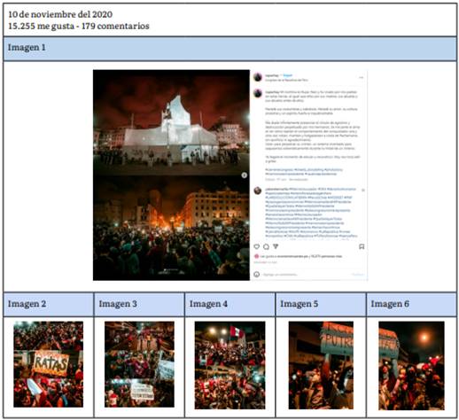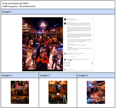 Esta sección se divide en dos apartados. El primero, presenta el contexto sociopolítico peruano en noviembre del 2020. El segundo, presenta un análisis visual y crítico de las publicaciones del Instagram Rupachay durante los días de las marchas en Lima. La mayoría de estas se componen de cuatro a siete imágenes publicadas y un texto verbal. Se analizan las publicaciones correspondientes a cada día de marcha del 10 al 15 de noviembre del 2020.