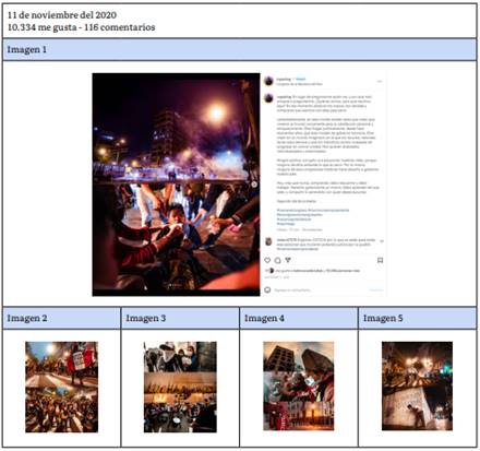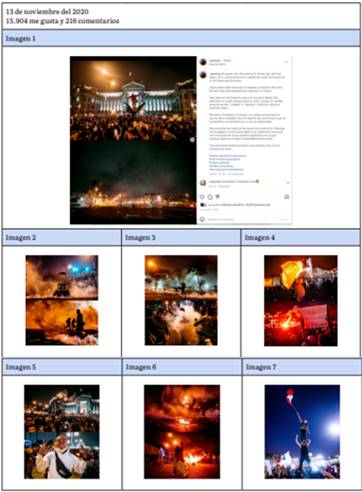 Respondemos a la pregunta a partir de un análisis de caso; el perfil de Instagram Rupachay, seudónimo de su joven usuario, participante de las marchas en Lima durante noviembre del 2020. La información para analizar son las imágenes publicadas y su relación con las descripciones textuales que las acompañan, durante seis de los días en que ocurrieron las marchas. Complementamos el análisis visual y crítico con información contextual proveniente de una entrevista a Rupachay, autor de dichas imágenes y textos.
