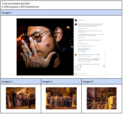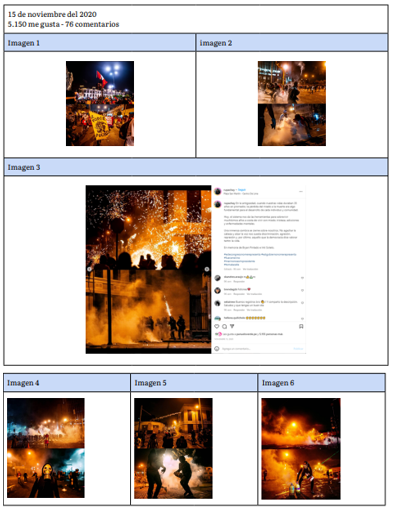 Esta publicación consta de seis imágenes, compuestas por dos fotografías cada una (ver figura 6). En conjunto, las imágenes muestran la diversidad de acciones de lucha, defensa, resistencia y solidaridad que se desarrollaron en las marchas y que, de alguna manera, revelan las dinámicas de los enfrentamientos que enmarcan la muerte de Inti Sotelo y Bryan Pintado. Estos dos jóvenes, simplemente, se negaron a vivir con miedo y agachando la cabeza. El énfasis está en el uso de las armas y bombas lacrimógenas por parte de la policía, y el coraje que mostraron los jóvenes al repeler los ataques. La acción de los jóvenes se desarrolló en desigualdad de fuerzas. Fue repelida con una represión aplastante.