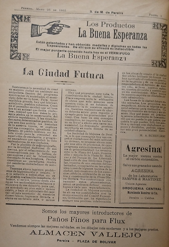 En este sentido, el objetivo del presente artículo es analizar la proyección que en los años treinta hicieron las élites de Pereira de una ciudad futuro, a la que dotaron de ambiciosos planes que debían realizarse para plasmar una urbe moderna. Así mismo, se quiere mostrar que hubo una articulación entre la propaganda periodística -donde se plasmaban las posiciones públicas de las élites- y los planes y proyectos de ciudad que fueron discutidos en los espacios públicos y políticos como el Concejo Municipal, la Alcaldía de Pereira, la Cámara de Comercio y la Sociedad de Mejoras Públicas, lo que dio forma a un imaginario de Pereira futura,4 el cual partía de una concepción crítica de la ciudad en la que se le presentaba como un territorio moderno -muy distante de la aldea de colonos y campesinos de 1863-, pero, al mismo tiempo, como una urbe inacabada en términos de progreso material y cultural.