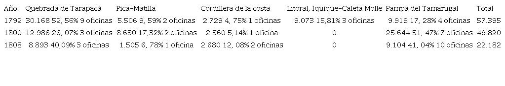 En total, registramos 26 oficinas en la quebrada a lo largo del siglo XVIII. La visita minera de 1792 registró en la quebrada nueve oficinas que produjeron 30.168, correspondientes al 56% de 57.395 marcos producidos en el partido (AGN, SC, Real Tribunal de Minería 1793, Legajo. 38 Doc. 21, f. 4). La visita de 1800 registró solo tres oficinas en operaciones: las de Francisco de la Fuente, Antonio Rivera y Matías González de Cossio. En relación al total aproximado de 49.820 marcos de plata producidos en las oficinas del partido, la quebrada participó con un 26,07 del total, correspondiente con 12.986 marcos (AHN, NT, Vol.3, f.74). Hacia 1808, en la quebrada solo continuaban funcionando las oficinas de Guarasiña de Francisco de la Fuente, la de Pedro Pérez Obligado y la del matrimonio Tinajas-Nestares, produciendo 8.893 marcos correspondientes al 40,09% de los escasos 22.182 marcos producidos en Tarapacá (AGN, SC, Real Tribunal Minería, 1809, Legajo. 38, Doc. 43, f. 03).
