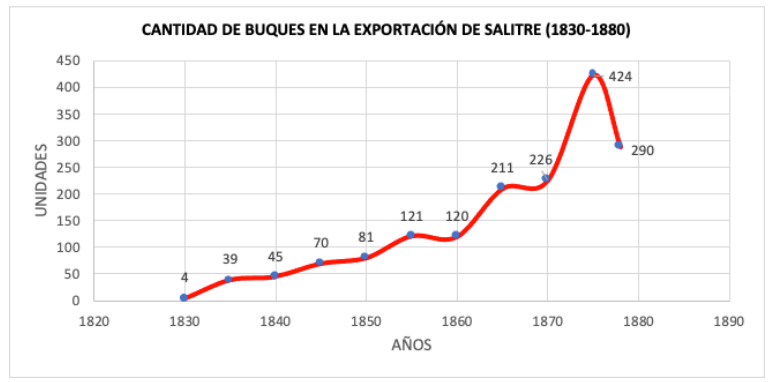 Ciertamente, la cantidad de barcos que arribaron a Iquique está ligada con el aumento de la exportación de salitre cuantificados en quintales españoles (Gráfico 3).